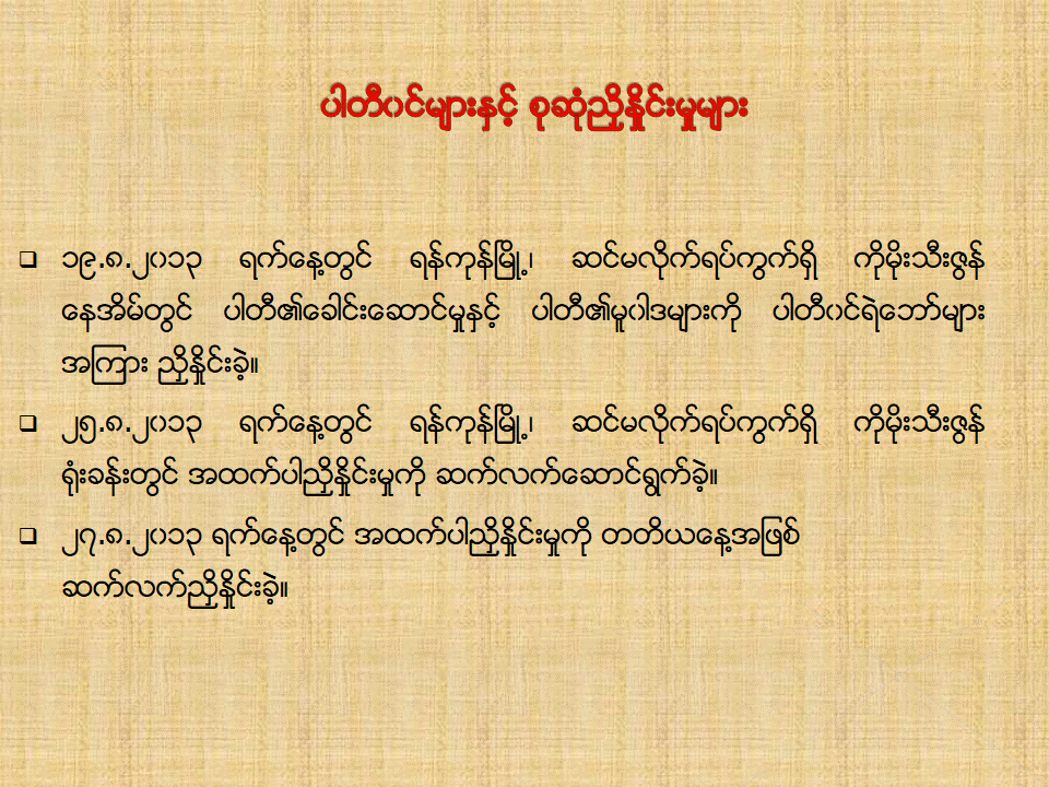 တရားဝင်နိုင်ငံရေးပါတီတစ်ရပ်အဖြစ် ပြည်တွင်းတွင် ပြန်လည်ရပ်တည်ရေးဆိုင်ရာ ဆောင်ရွက်ခဲ့မှုများ Slide12 Image 12 of 27