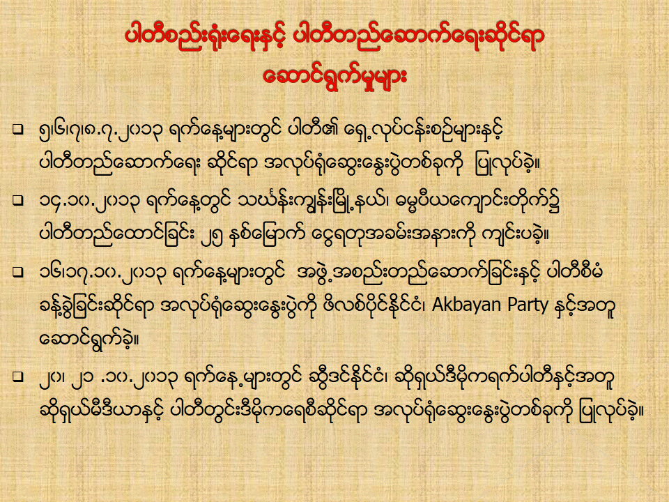 တရားဝင်နိုင်ငံရေးပါတီတစ်ရပ်အဖြစ် ပြည်တွင်းတွင် ပြန်လည်ရပ်တည်ရေးဆိုင်ရာ ဆောင်ရွက်ခဲ့မှုများ Slide18 Image 18 of 27