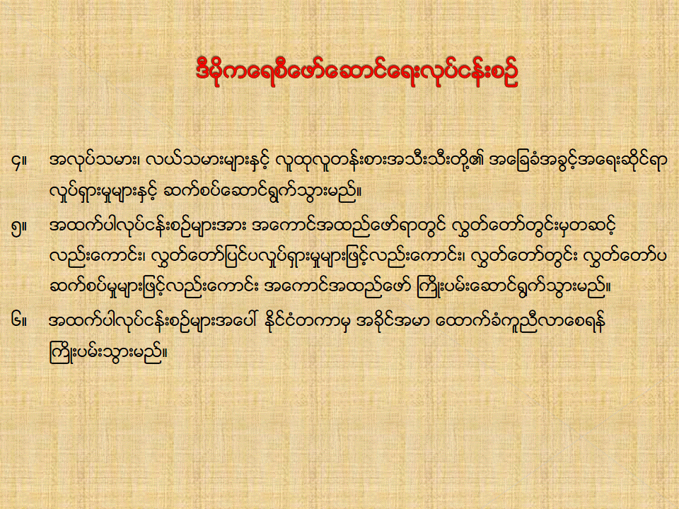 တရားဝင်နိုင်ငံရေးပါတီတစ်ရပ်အဖြစ် ပြည်တွင်းတွင် ပြန်လည်ရပ်တည်ရေးဆိုင်ရာ ဆောင်ရွက်ခဲ့မှုများ Slide24 Image 24 of 27