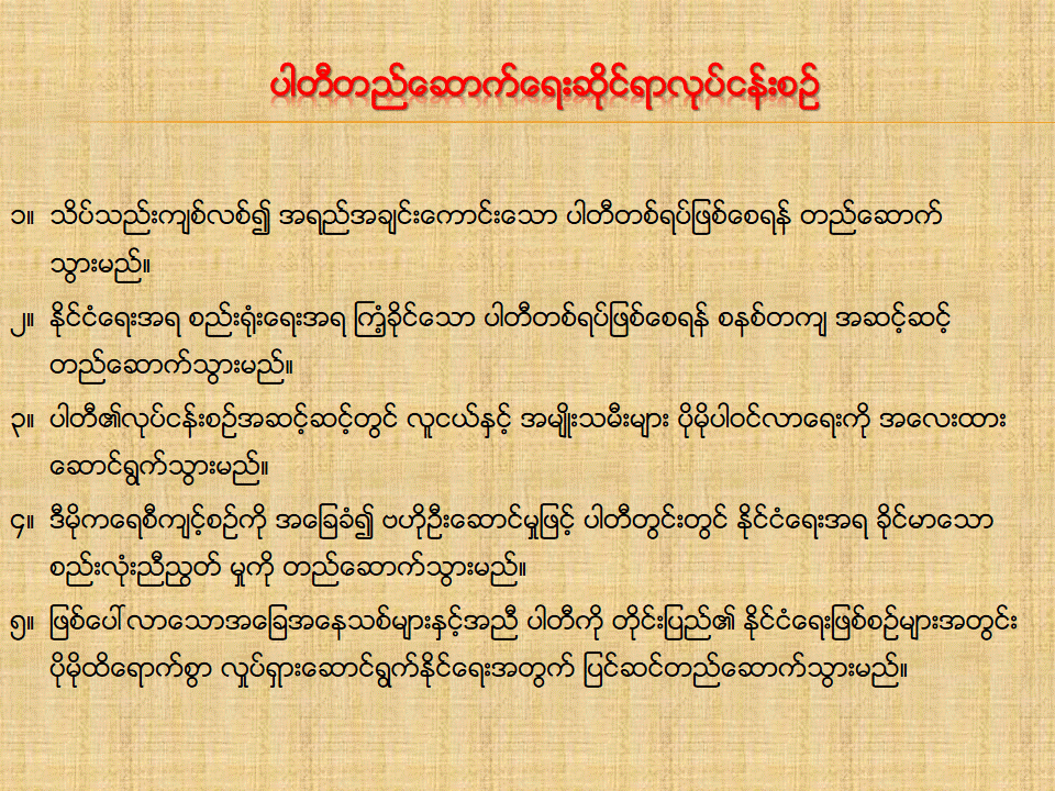 တရားဝင်နိုင်ငံရေးပါတီတစ်ရပ်အဖြစ် ပြည်တွင်းတွင် ပြန်လည်ရပ်တည်ရေးဆိုင်ရာ ဆောင်ရွက်ခဲ့မှုများ Slide26 Image 26 of 27