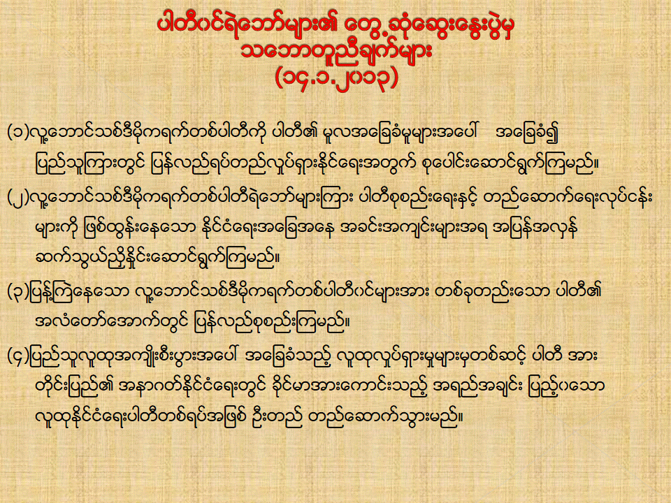 တရားဝင်နိုင်ငံရေးပါတီတစ်ရပ်အဖြစ် ပြည်တွင်းတွင် ပြန်လည်ရပ်တည်ရေးဆိုင်ရာ ဆောင်ရွက်ခဲ့မှုများ Slide07 Image 7 of 27