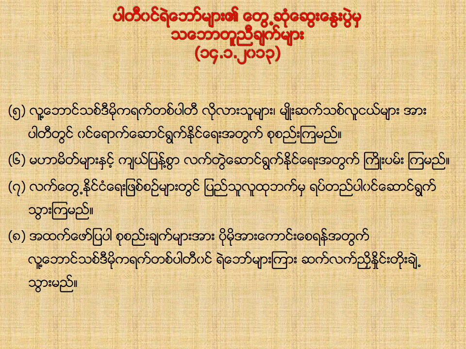 တရားဝင်နိုင်ငံရေးပါတီတစ်ရပ်အဖြစ် ပြည်တွင်းတွင် ပြန်လည်ရပ်တည်ရေးဆိုင်ရာ ဆောင်ရွက်ခဲ့မှုများ Slide08 Image 8 of 27
